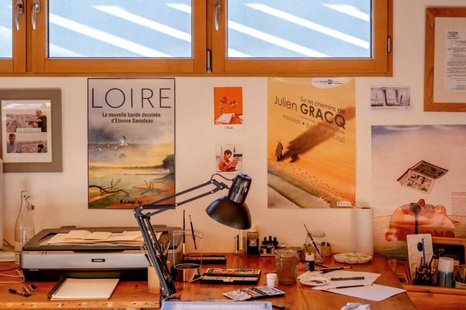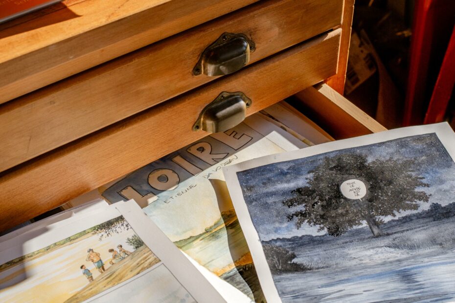 La douceur angevine qu’évoquait Joachim Du Bellay n’est pas une légende. Étienne Davodeau, prolifique auteur de bandes dessinées, natif et résident de la région, en reproduit les couleurs mordorées et les reflets pastel dans son dernier album, Loire. Il nous ouvre son atelier et nous emmène faire un tour à vélo. Parce que oui, il est aussi cycliste, et depuis longtemps.